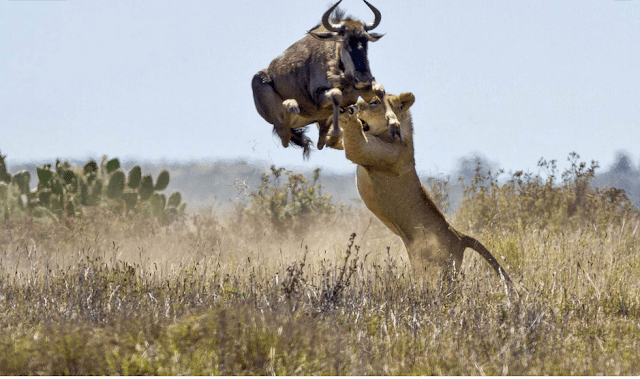 Gnu salta a uma altura de 2 metros tentando evitar o ataque de uma leoa faminta na reserva de Kariega, na África do Sul. A cena impressionante ocorreu em frente a encarregados de caça da reserva, que viram o gnu fugir após o pulo diante do perigo.