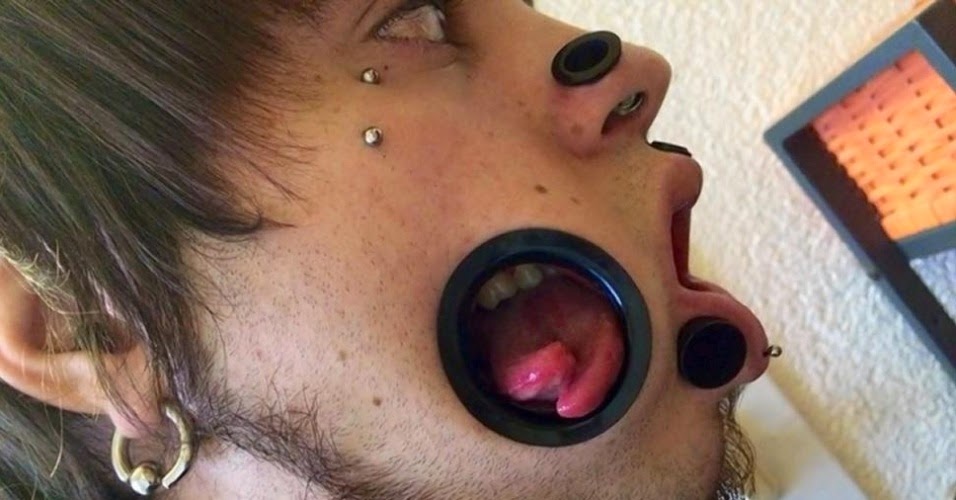 O alemão Joel Miggler tem 23 anos, a língua dividida em duas partes e várias tatuagens. No entanto, o que mais chama atenção no seu corpo é um ‘buraco’ aberto de cada lado do rosto, na área da bochecha.
